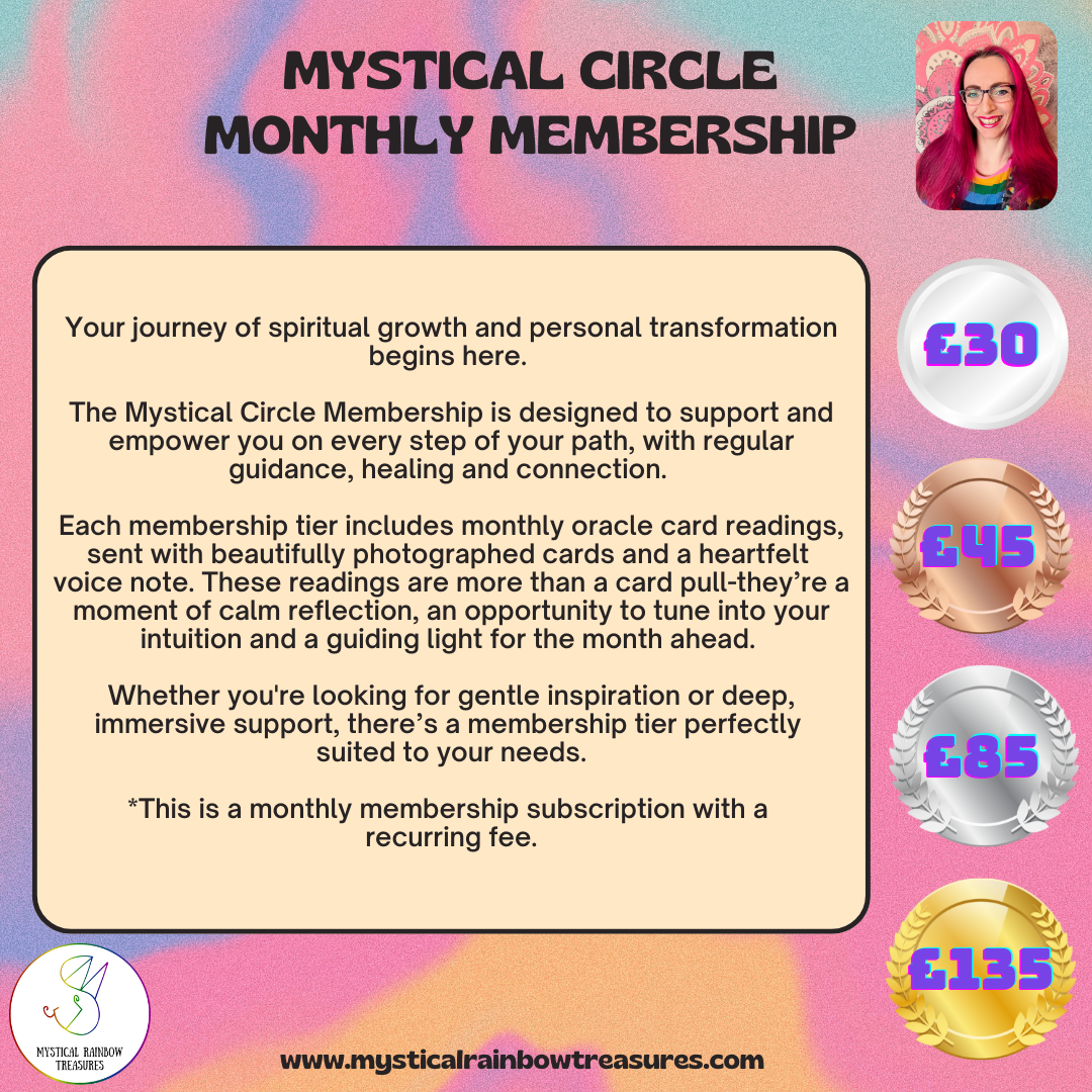 Your journey of spiritual growth and personal transformation begins here. The Mystical Circle Membership is designed to support and empower you on every step of your path, with regular guidance, healing and connection. Each membership tier includes monthly card readings, sent with a beautifully photographed card and a heartfelt voice note. These readings are more than a prediction-they’re a moment of calm reflection, an opportunity to tune into your intuition, and a guiding light for the week ahead. Whether you're looking for gentle inspiration or deep, immersive support, there’s a membership tier perfectly suited to your needs.